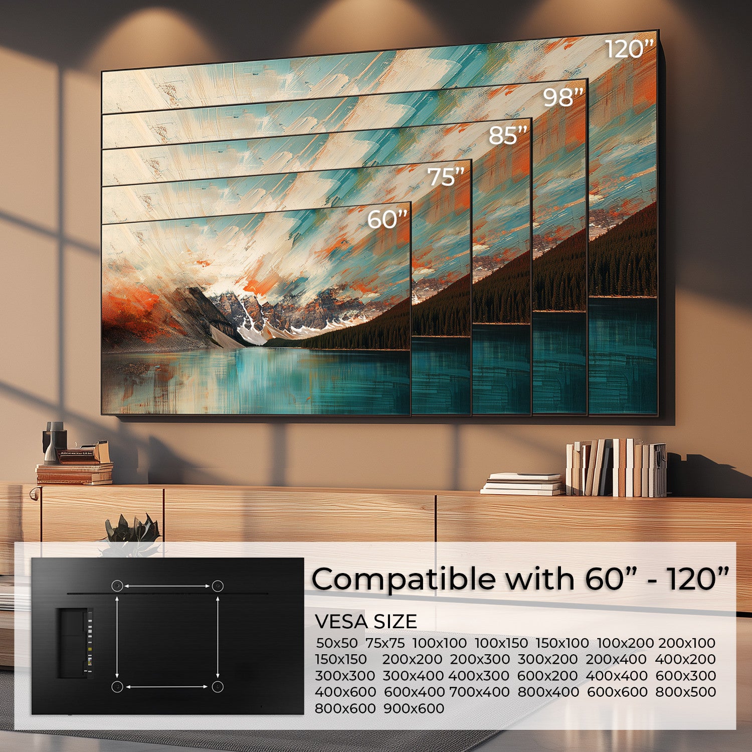 - Vhodné pre televízory s uhlopriečkou od 60" do 120" (alebo väčšie, ak hmotnosť nepresahuje 120 kg a štandard VESA je s držiakom kompatibilný)