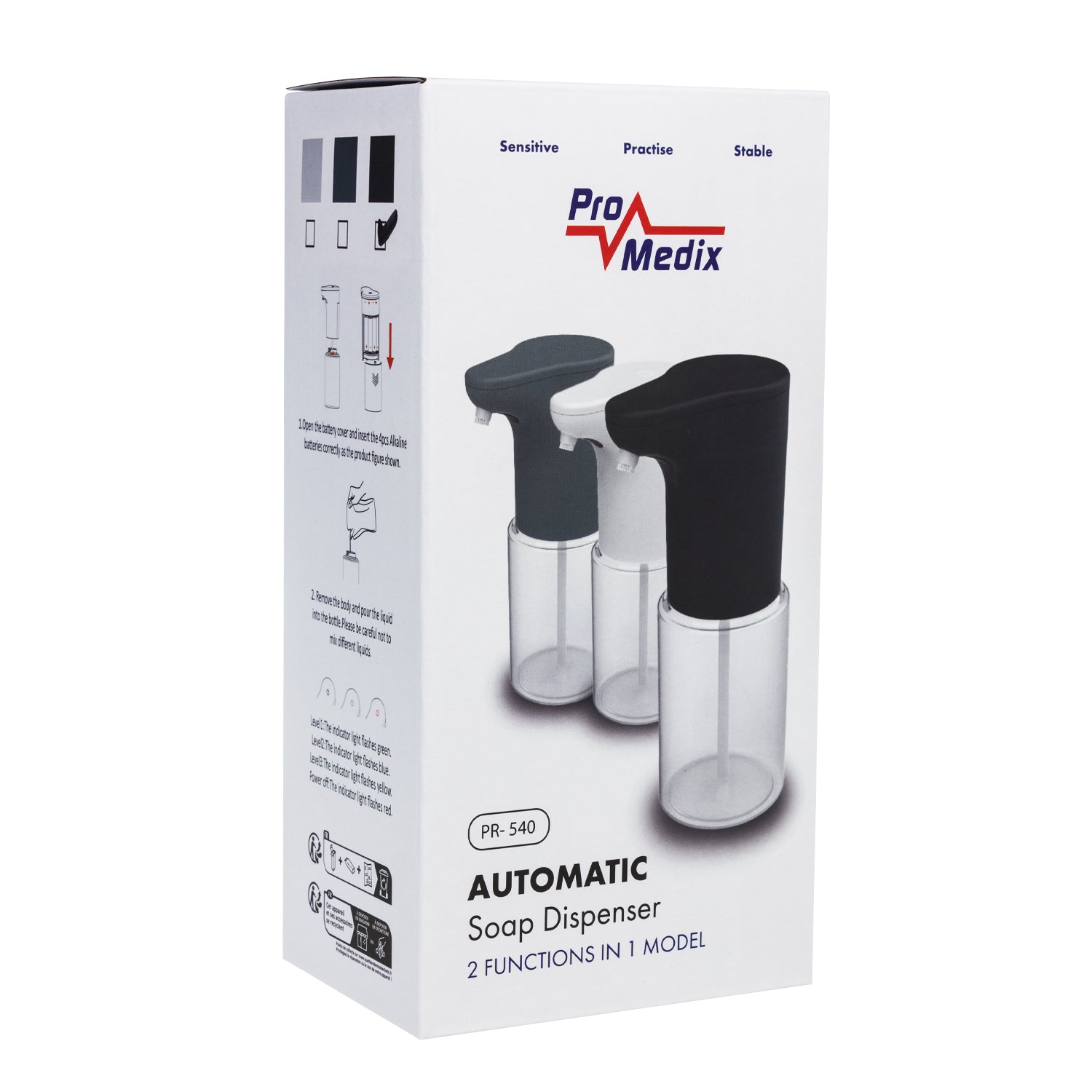 Automatický dávkovač Promedix PR-540 je praktické zariadenie na dávkovanie tekutých mydiel, tekutých a dezinfekčných gélov, sprchových gélov, šampónov atď. Má kapacitu 300 ml, takže je ideálny na použitie v domácnosti alebo na verejných miestach. Napája sa štyrmi batériami typu AA a poskytuje pohodlie a jednoduché používanie. Dávkovač sa dodáva s vysokokvalitnými priemyselnými batériami Varta.