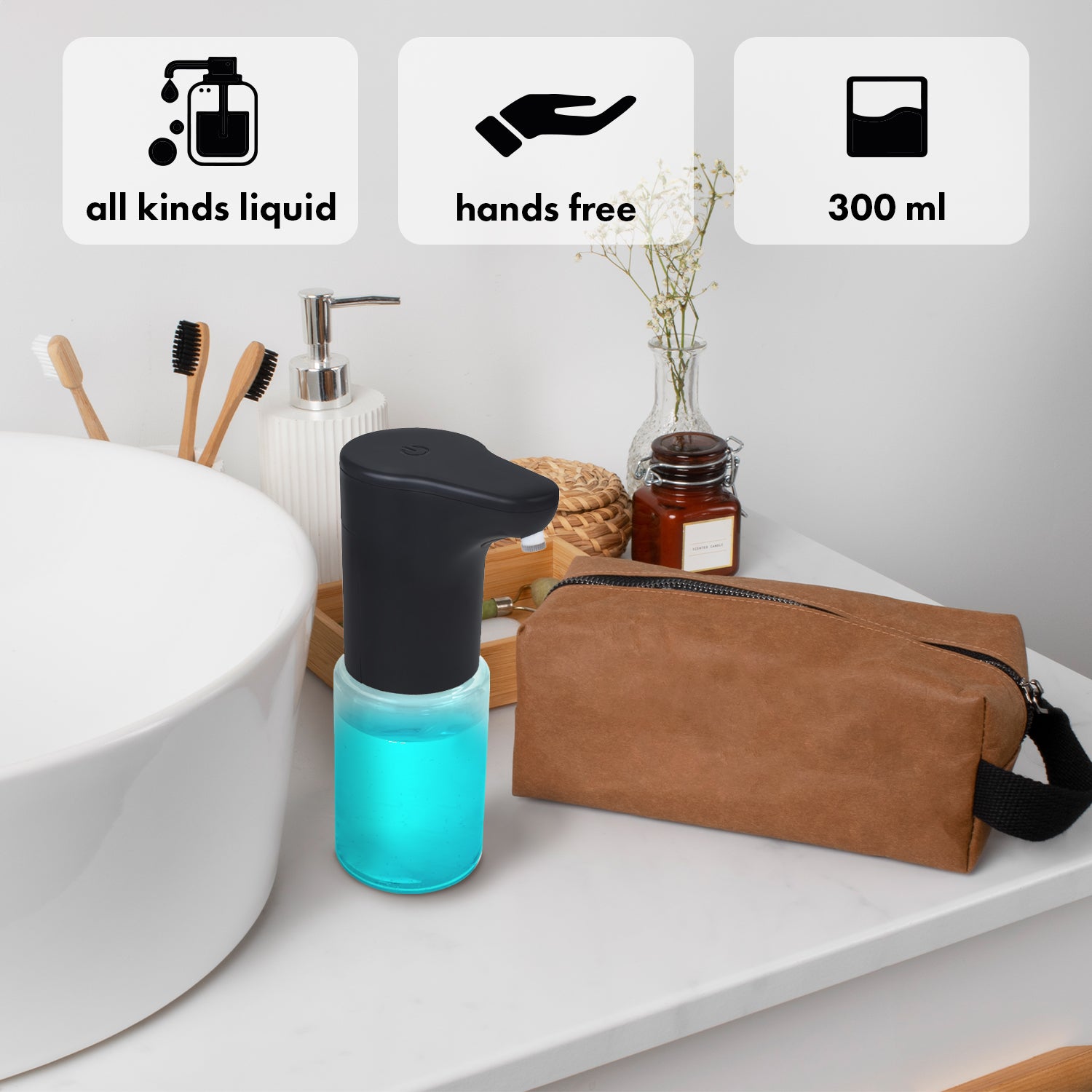 - Vhodný na tekuté mydlo, sprchový gél, šampón, dezinfekčný prostriedok na ruky a dezinfekčný prostriedok na ruky