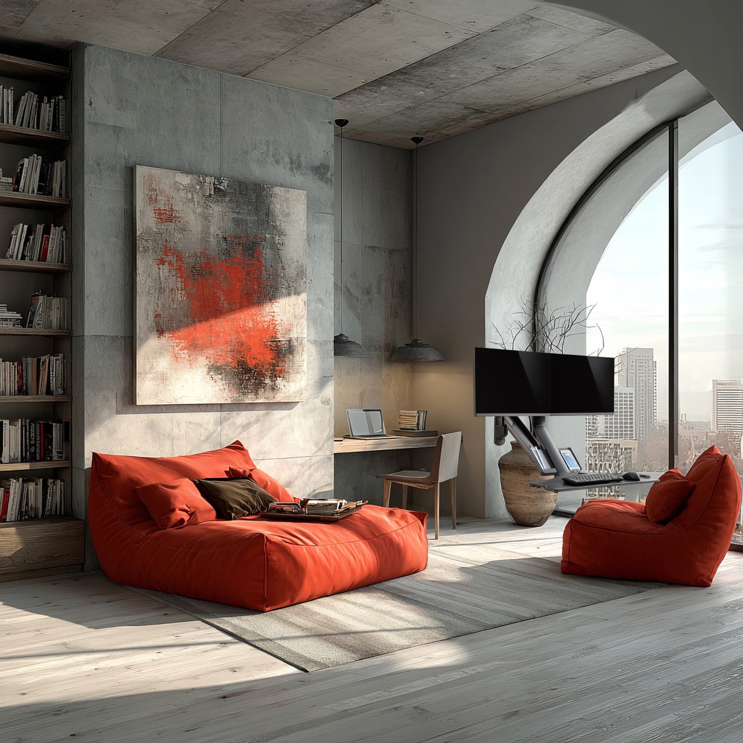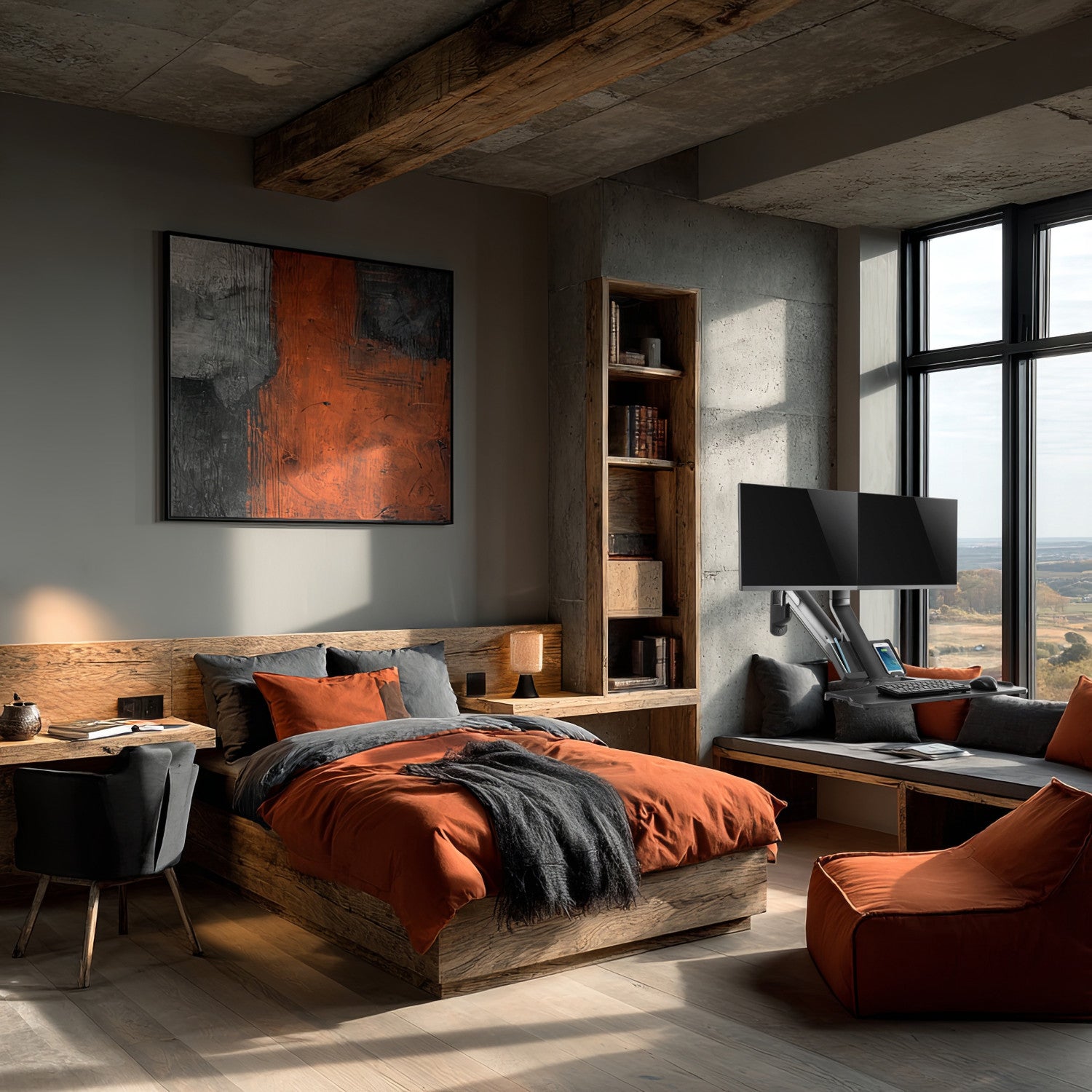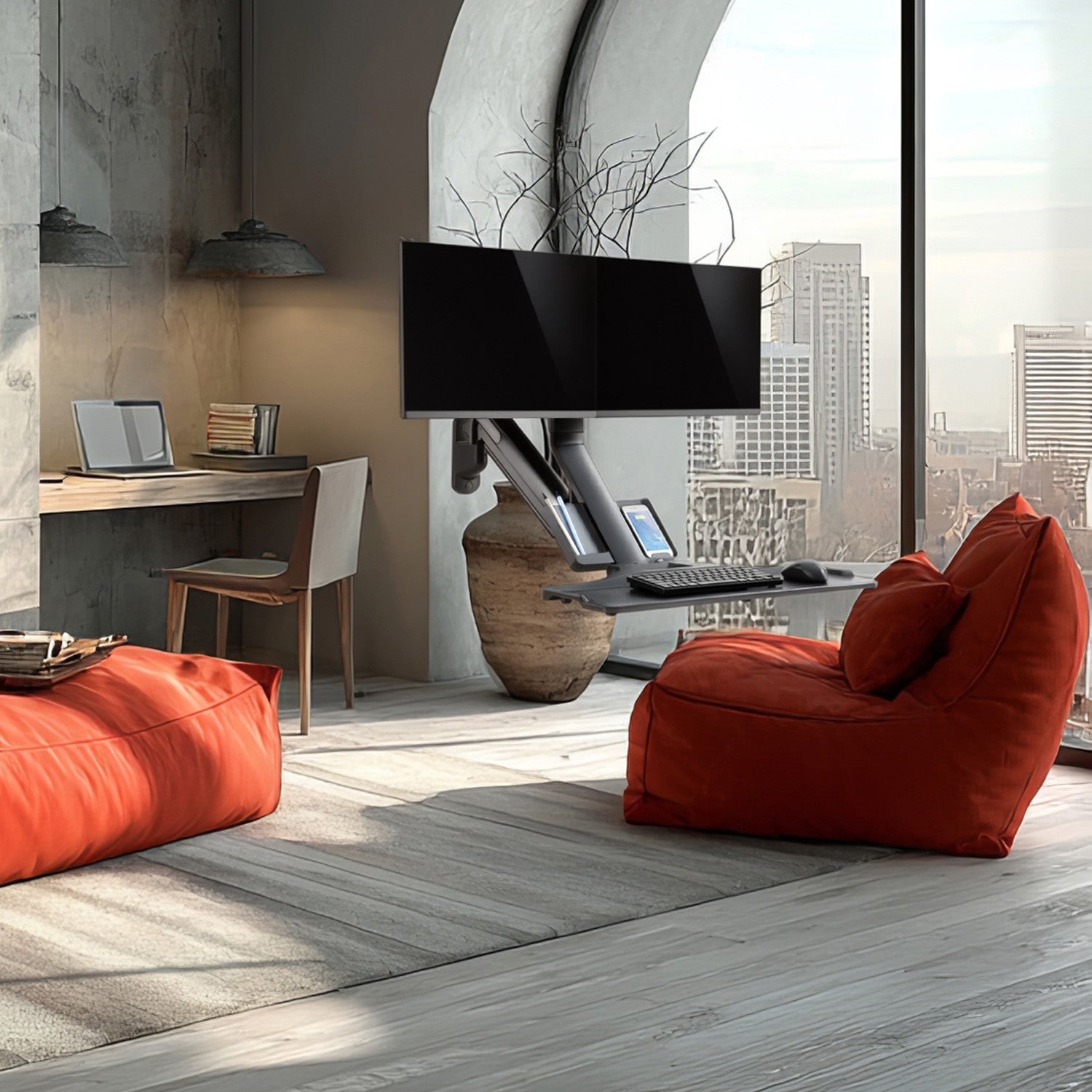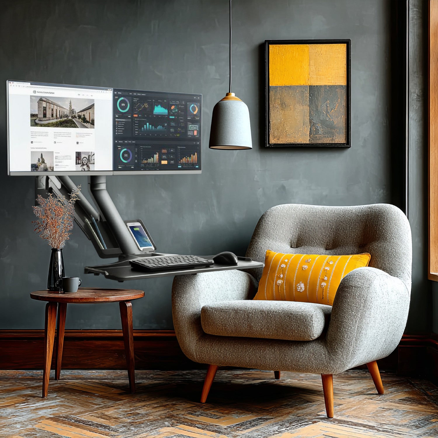 Univerzálna nástenná pracovná stanica s držiakom pre dva monitory a klávesnicu, ktorá vám umožní pracovať na počítači bez potreby stola.