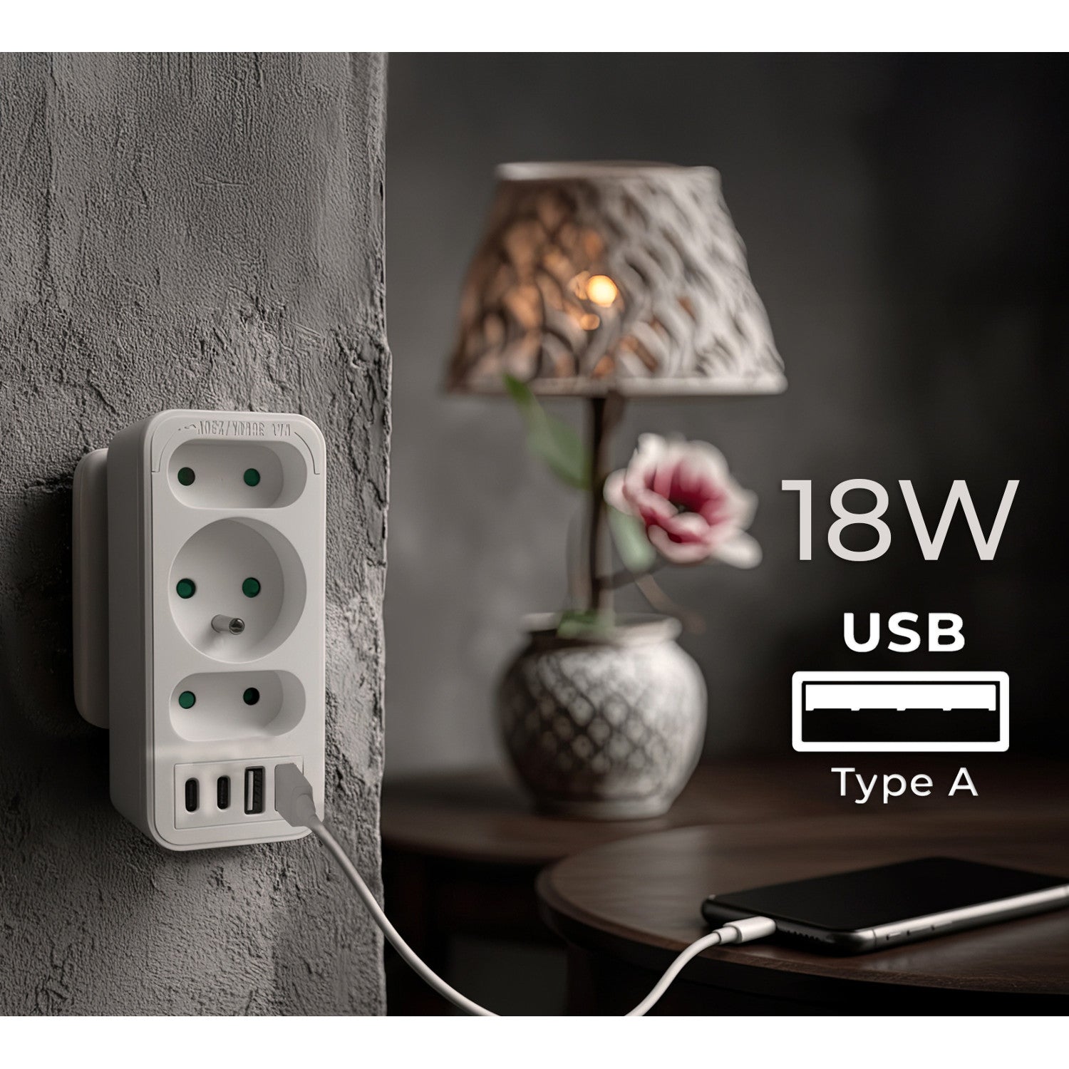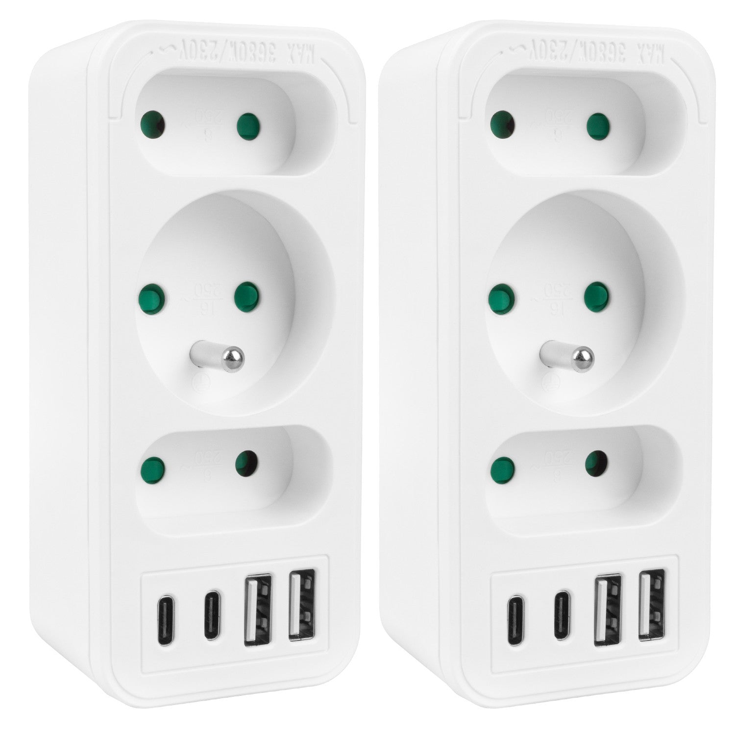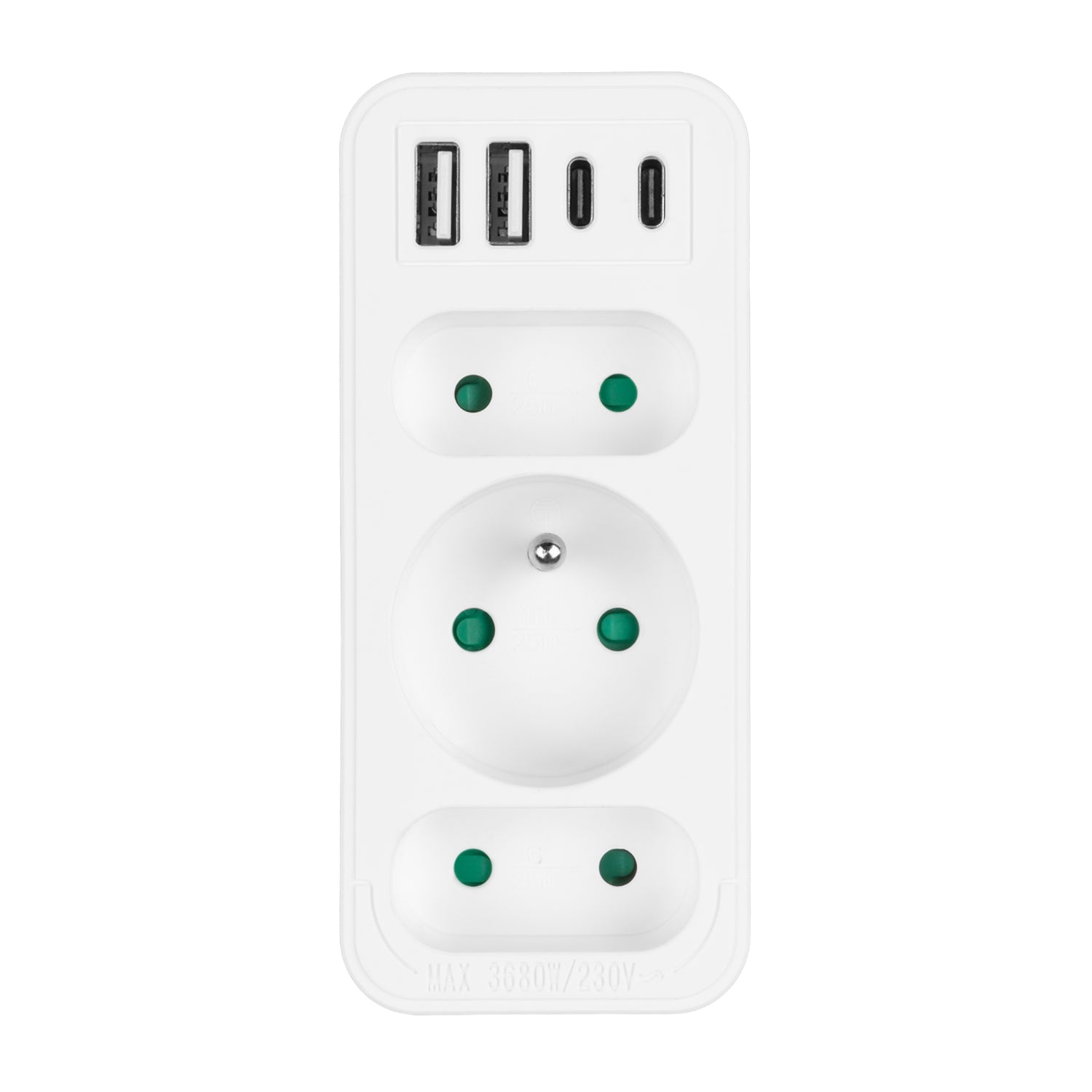 2x splitter 3 zásuvky 2x USB-A 2x USB-C biela