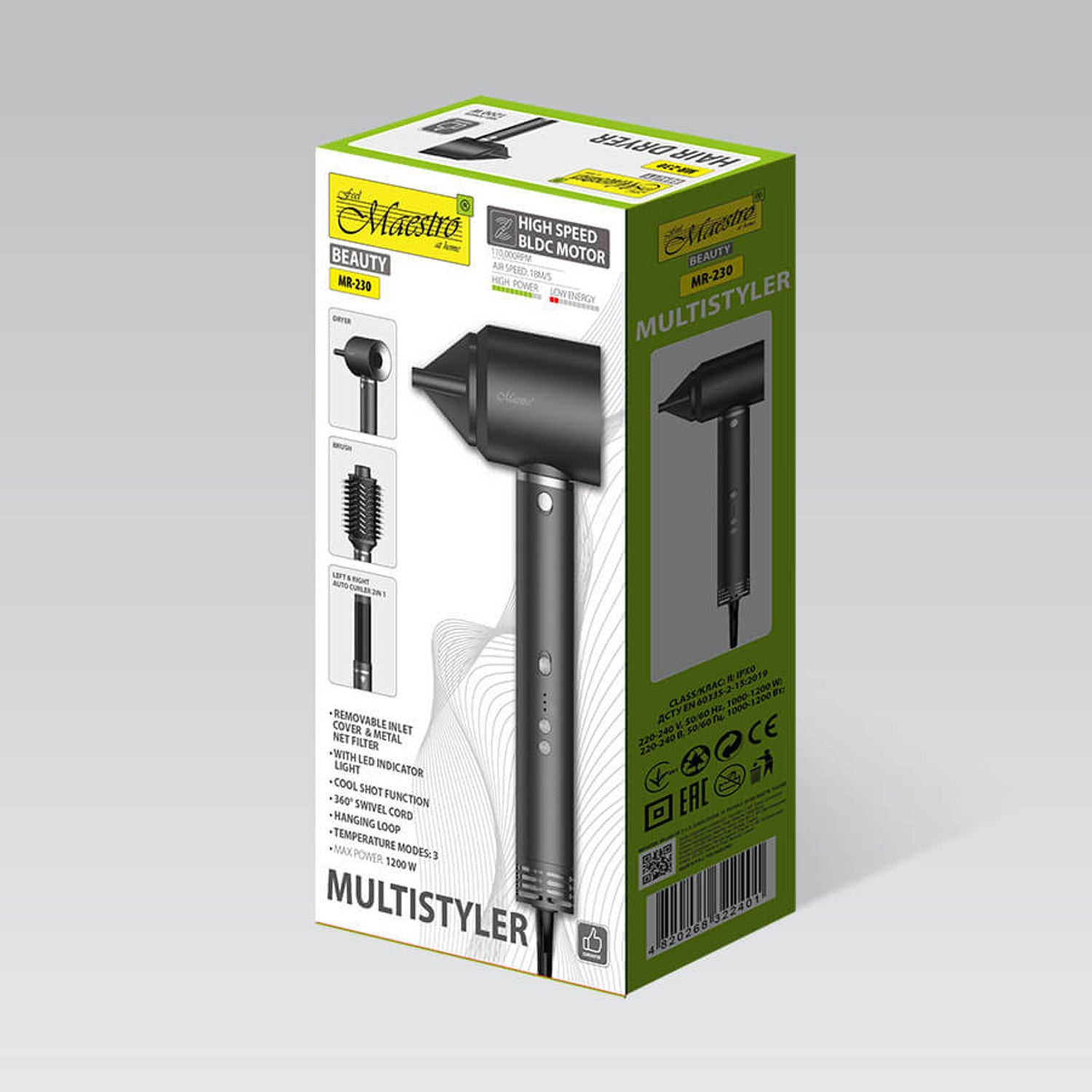 Funkčný multistyler MR-230 je inovatívna súprava na starostlivosť o vlasy 3 v 1, ktorá kombinuje sušič vlasov, sušiacu kefu a automatickú kulmu. Vďaka výkonu 1200 W a vysokorýchlostnému motoru BLDC dosahujúcemu 11 000 otáčok za minútu poskytuje zariadenie rýchle a účinné sušenie a úpravu vlasov.