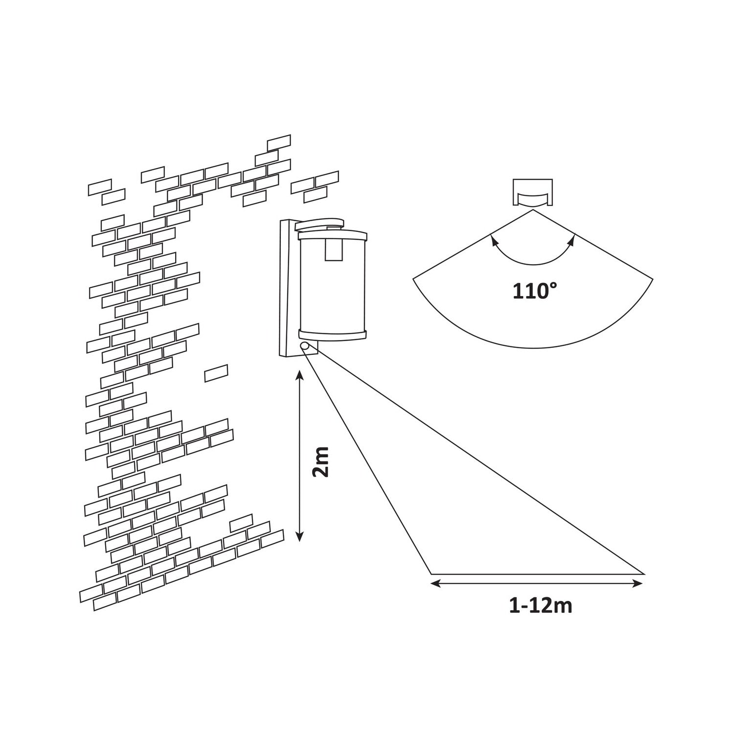 - Snímač sníma pohyb na vzdialenosť 1-12 metrov a pod uhlom 110°