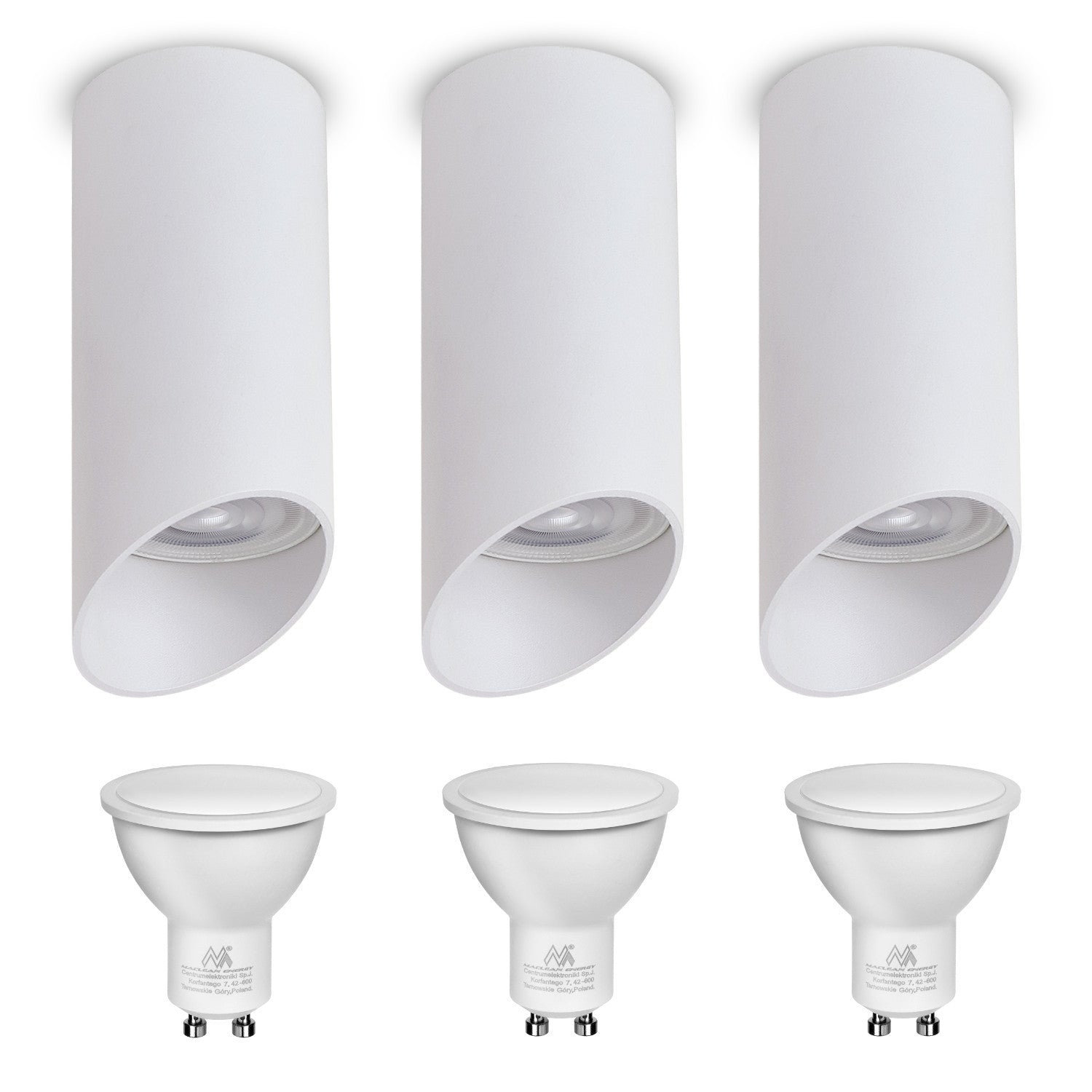 Maclean povrchové svietidlo / trubica, bodové, kruhové, hliníkové, GU10, 55x130mm, biele, MCE360 W 3ks + LED žiarovka GU10 7W Maclean Energy MCE437 WW teplá biela 3000K, 220-240V~, 50/60Hz, 3ks