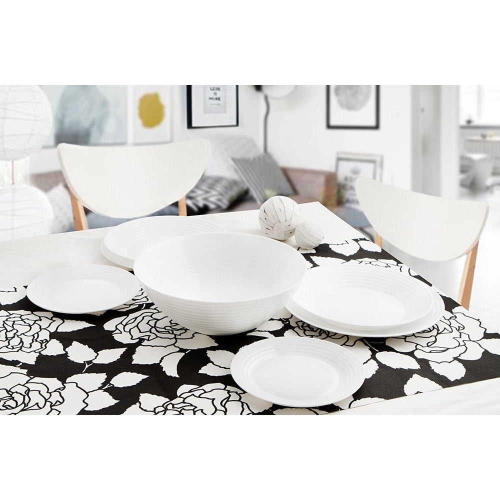 Večera Set 19-element Harena - stolový riad z tvrdeného skla, ktorý podlieha špecifickému tepelnému spracovaniu, ktorý zaručuje lepšiu kvalitu a odolnosť proti nárazom a nárazom. Sklo je neporézny materiál, takže nezachováva žiadne mikroorganizmy, je 100% hygienický. Zberná nádoba Harena sa vyznačuje vzorom / razením na okrajoch dosiek. Dosky zvyšujú odolnosť voči nárazom a nárazom. Vďaka nízkej cene ich často kupujú individuálni užívatelia pre domácnosti, ako aj profesionálna gastronómia. Pôsobí dokonale v rôznych tabuľkových usporiadaniach.