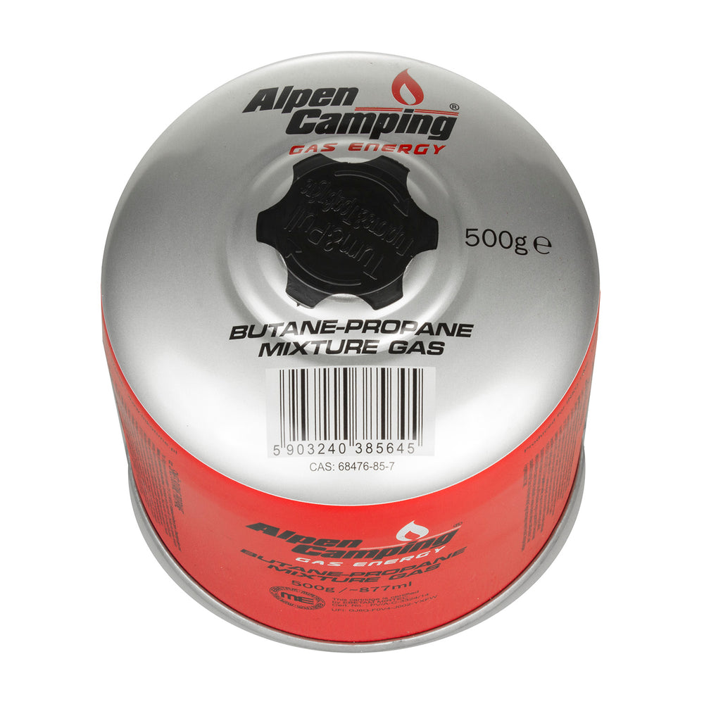 Alpen Camping 500g plynová kartuša. Certifikát: Rozsah -10°c až + 40°c, 7/16" závitový ventil IK008