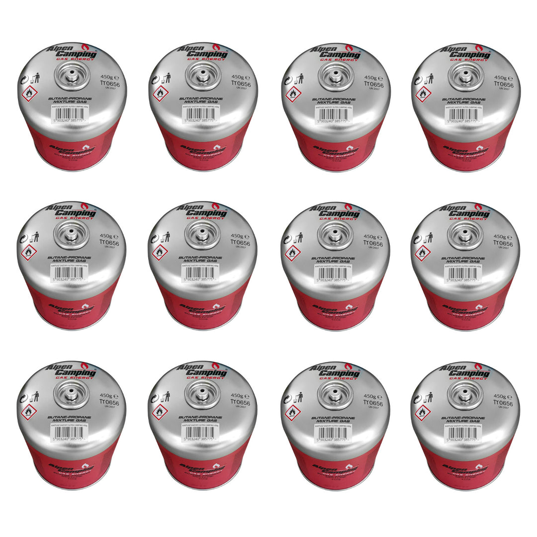 Alpen Camping 450g plynová kartuša. Certifikát: Rozsah -10°c až + 40°c, 7/16" závitový ventil IK020, 12 kusov