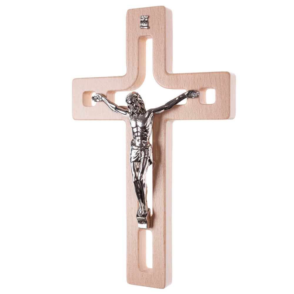 Drevený závesný kríž moderný s mučenkou prírodný 30x18x1,8cm