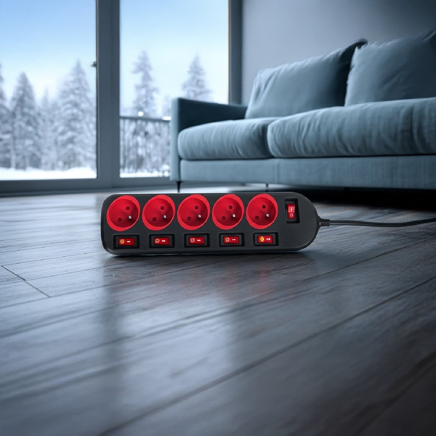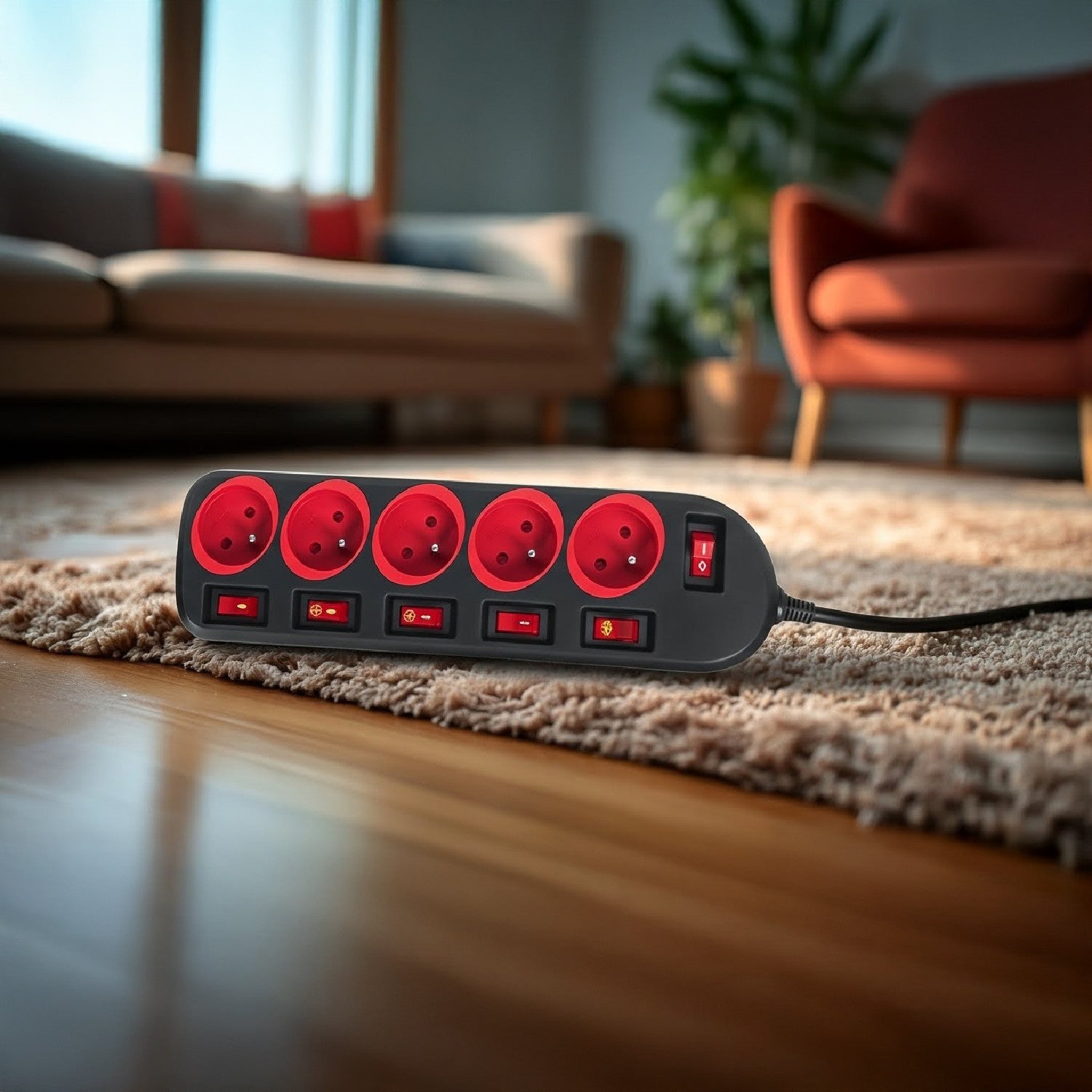 Napájacia lišta s 5 zásuvkami umožňuje súčasné pripojenie až piatich zástrčiek plnej veľkosti. Má detskú poistku, podsvietený sieťový vypínač a samostatné vypínače pre každú zásuvku.