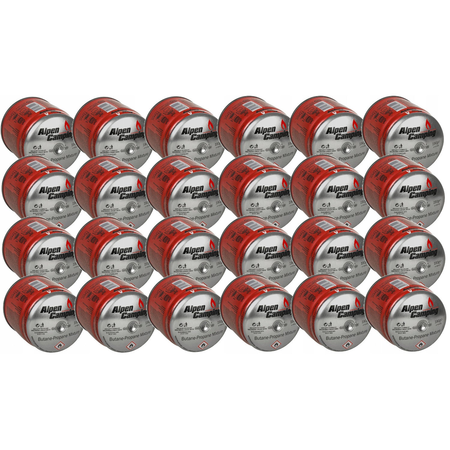 24x Alpen Camping 400ml plynová kartuša. Certifikát: Rozsah -10°c až + 40°c, systém GAS STOP IK006